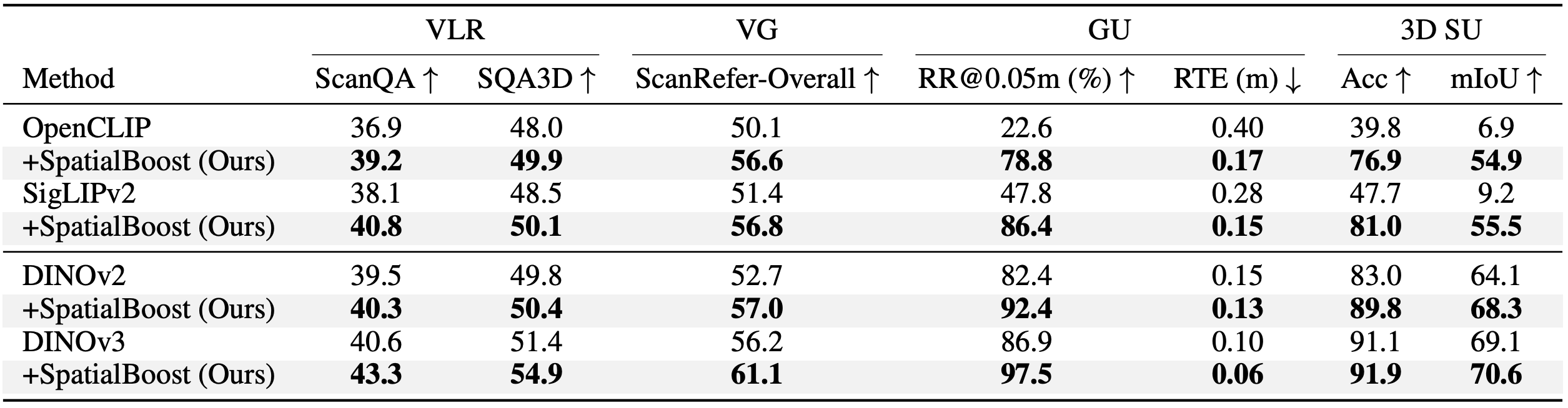 We evaluate SpatialBoost on 3D benchmark, Lexicon3D. The benchmark consists of diverse 3D-centric tasks such as Vision-Language Reasoning (VLR), Visual Grounding (VG), Geometry Understanding (GU), and 3D Semantic Understanding (3D SU). SpatialBoost outperforms all 3D-centric tasks in Lexicon3D.