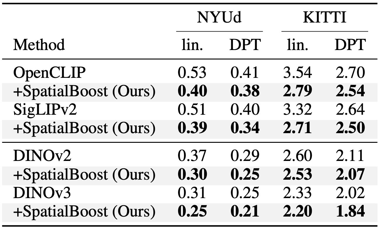 SpatialBoost enhances the visual representation on explicit spatial task. The performance of DINOv2 with SpatialBoost (0.25) on NYUd matches with DINOv3 (0.25).