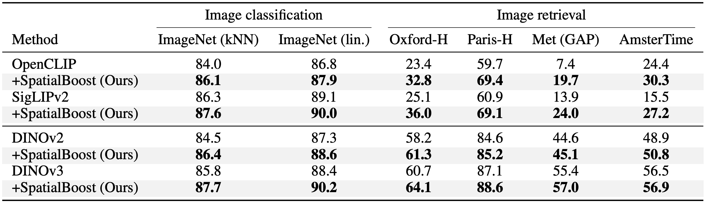 SpatialBoost enhances general knowledge of the visual representation. We evaluate SpatialBoost on image classification and retrieval tasks. Consistent performance gain on these tasks indicates the SpatialBoost is not overfitted to specific 3D knowledge.