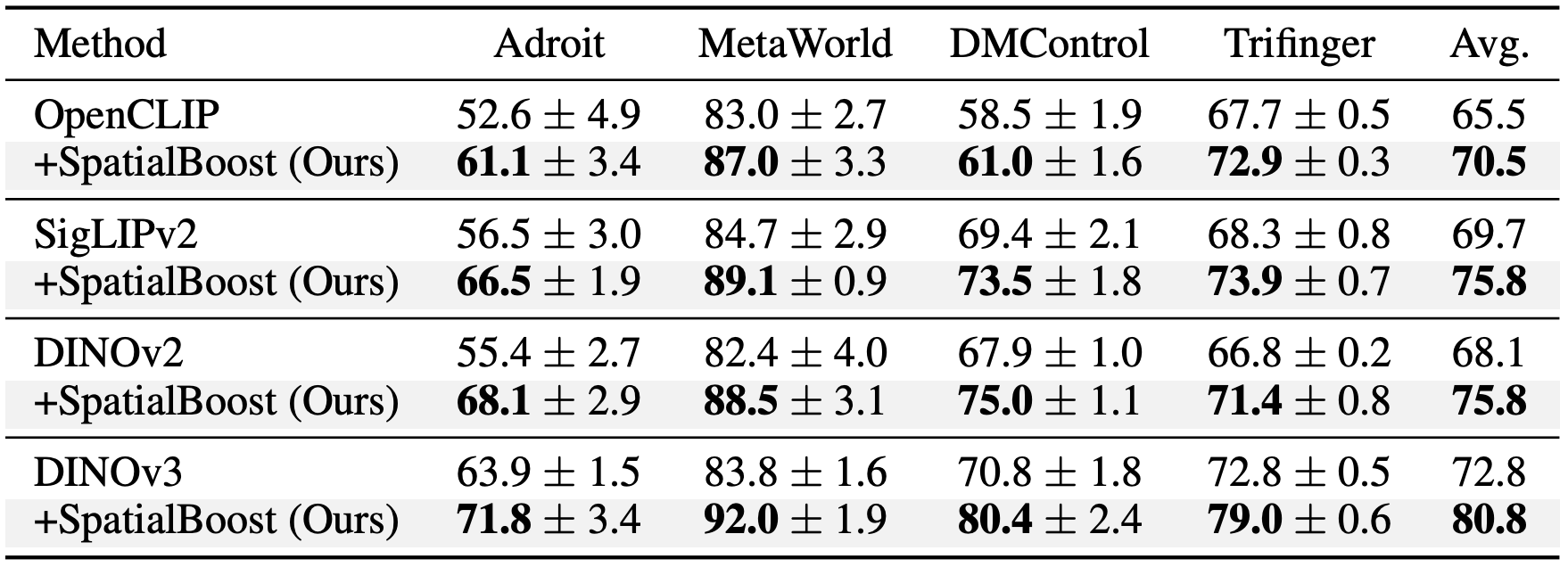 SpatialBoost enhances the visual representation on robot learning that requires spatial knowledge. The performance of OpenCLIP (70.5) and DINOv2 (75.8) with SpatialBoost on par with the state-of-the-art vision encoder, SigLIPv2 (69.7) and DINOv3 (72.8), respecitvely.