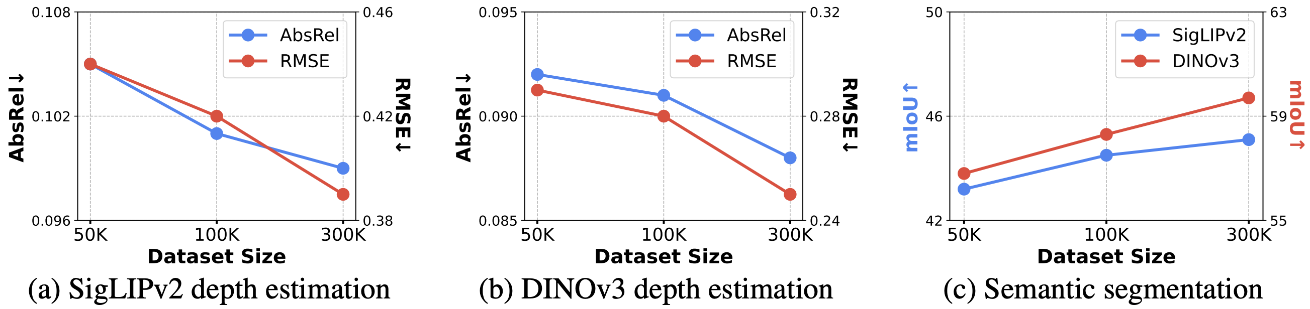 SpatialBoost shows scalability along with data size. The performance on monocular depth estimation and semantic segmentation enhances as the size of the data grow up.