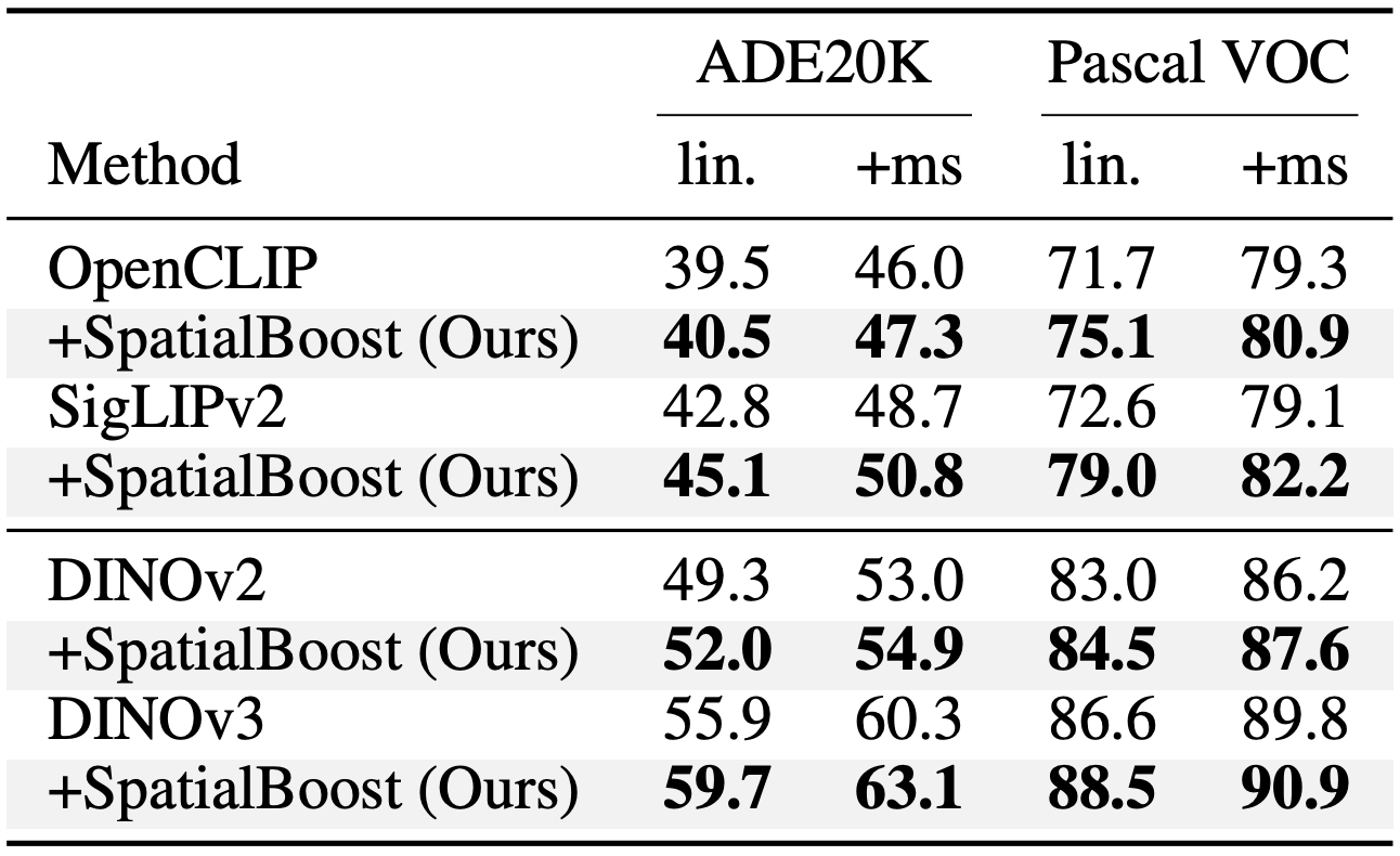 SpatialBoost enhances the visual representation on spatially-related tasks. The performance of DINOv3 rises from 55.9 to 59.7 mIoU, achieving state-of-the-art performance.